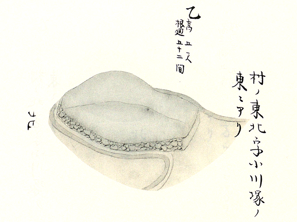 墳丘の発掘調査が行われていないため、葺石、周濠の有無については不明。墳形は、直径35mの円墳と推定されています。ただ明治時代に作成された見取り図には、南側に少し突出した部分が描かれていることから、前方後円墳との説もあります。