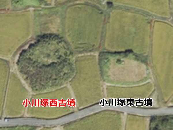 東西に並ぶ2基の古墳ですが、どちらも川が埋め立てられた後に築かれた古墳ということですが、同時期に築造されたのかは分かりません。また小川塚西古墳は方墳または円墳と考えられていますが、小川塚東古墳は円墳もしくは前方後円墳と考えられています。距離が近いことから、何らかの関係があると思われますが、埋葬施設も遺物も不明なため、詳しいことは分かっていません。