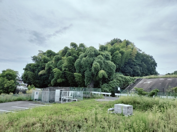 こちらが東側から見た六反池古墳。竹と雑草と樹木が生い茂り墳丘が全く見えません。